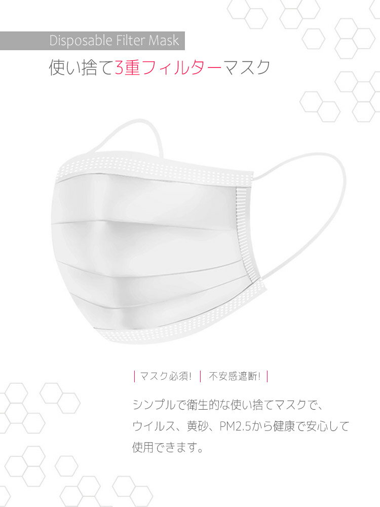 商品名 使い捨て3重フィルターマスク(50枚入り) 素 材 ポリプロピレン、+不織布 サイズ 17.5X15X9.5cm カラー WHITE 備考 シンプルで衛生的な使い捨てマスクで、ウイルス、黄砂、PM2.5から健康で安心して使用できます。
